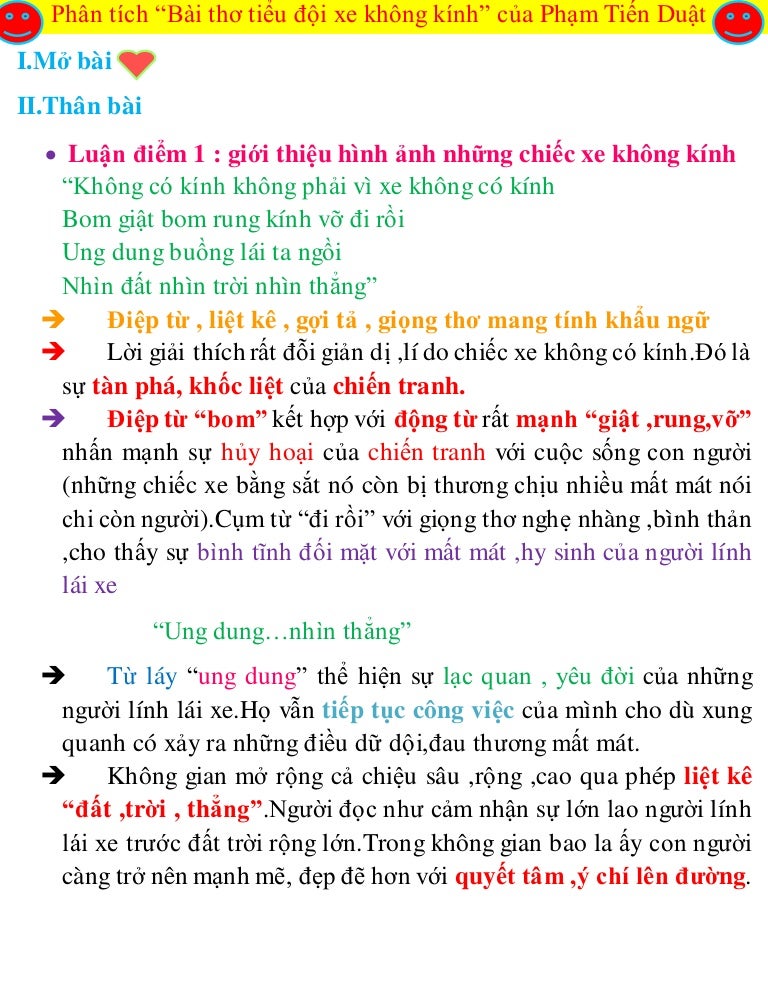 Phan tich bai tho tieu doi xe khong kinh các em học sinh cùng tham khảo bài văn mẫu phân tích bài thơ tiểu đội xe không kính một bài thơ tiêu biểu của phạm tiến duật. Phân tích khổ 7 bài thơ về tiểu đội xe không kính bài thơ về tiểu đội xe không kính của phạm tiến duật đã ghi dấu vẻ đẹp người lính là vẻ đẹp ở tư thế của người ra trận đầy khốc liệt trộn không lẫn của tuyến đường vận tải có một không hai trên thế giới với một khí phách lái xe bất chấp mọi bom đạn nắng mưa gió bụi đói ăn đói ngủ. Thân bài hình ảnh những chiếc xe không kính hình ảnh người chiến sỹ lái xe. Bài văn mẫu từ nơi em gửi đến nơi anh những đòan quân trùng trùng ra trận như tình yêu nối lời vô tận đông trường sơn nối tây trường sơn.
