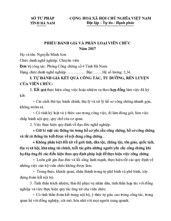 Phiếu đánh Giá Và Phân Loại Viên Chức