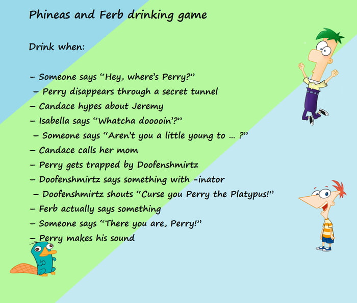 Phineas And Ferb Drinking Game Drink When Sammy Says Hey Where S Perry Perry Disappears Through N Mm Tunnel Candace Hype About Jammy R Isabella Says Whatcha Dvoaoin Someone Aren T
