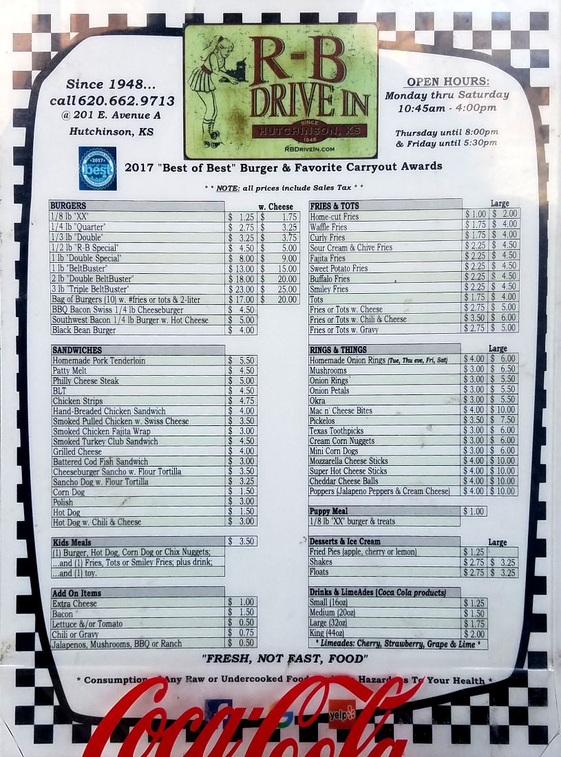 Check with this restaurant for current pricing and menu information. Top reviews of r b restaurant 4 0 stars based on 4 reviews. R b s menu. Kansas oldest drive in since 1948.