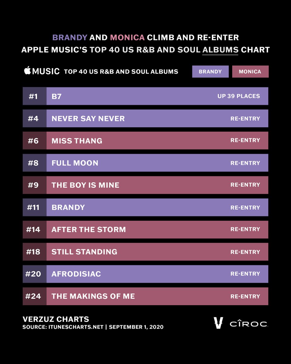 Verzuz On Twitter The Verzuz Effect In Real Time Post Verzuz Battle Brandy S Album B7 Climbed To 1 Along With Her And Monica S Albums Re Entering Apple Music S Top 40 R B Soul Albums Chart
