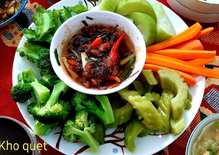 Rau luộc kho quẹt. Kho quẹt là một loại mắm chấm dân dã của người miền tây có vị thơm ngon đậm đà chấm cùng rau củ luộc thì ngon miễn chê. Hôm nay kiến thức nội trợ hướng dẫn các bạn cách làm kho quẹt để dùng trong gia đình nhé. Rau luộc kho quẹt kho quẹt má hà ngày nay tuy biến tấu có thêm nhiều gia vị trong chế biến nhưng kho quẹt vẫn giữ được cái hồn xưa biến tấu để ngon hơn thơm hơn dinh dưỡng hơn nhưng cái hương vị cái giá trị tinh thần thì không bao giờ thay đổi được. Kho quẹt là món ăn dân dã nam bộ kho quẹt có thể ăn kèm cơm trắng cơm cháy hoặc dùng chấm rau củ luộc đều rất ngon miệng.
