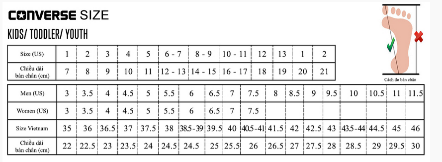 Mã số thuế. Converse chính hãng sale 50. Cách tính size giày converse chính hãng mới nhất. 1 hãy đi đôi tất mà bạn dự định đi với kiểu giày bạn sắp mua đo cả hai bàn chân và chọn đôi giày có cỡ bằng với chân lớn hơn của bạn nếu có sai số giữa hai.