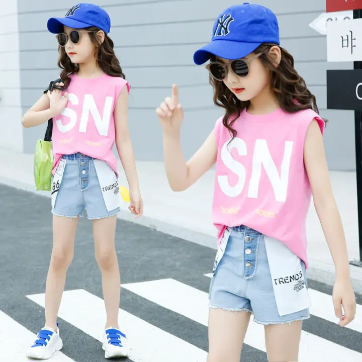Quần Ao Trẻ Em Thời Trang In Chữ Ao Thun Khong Tay Cho Trẻ Em Be Gai Cộng Với Quần Short Jean Bộ Quần Ao Be Gai 4 15 Tuổi Lazada Vn