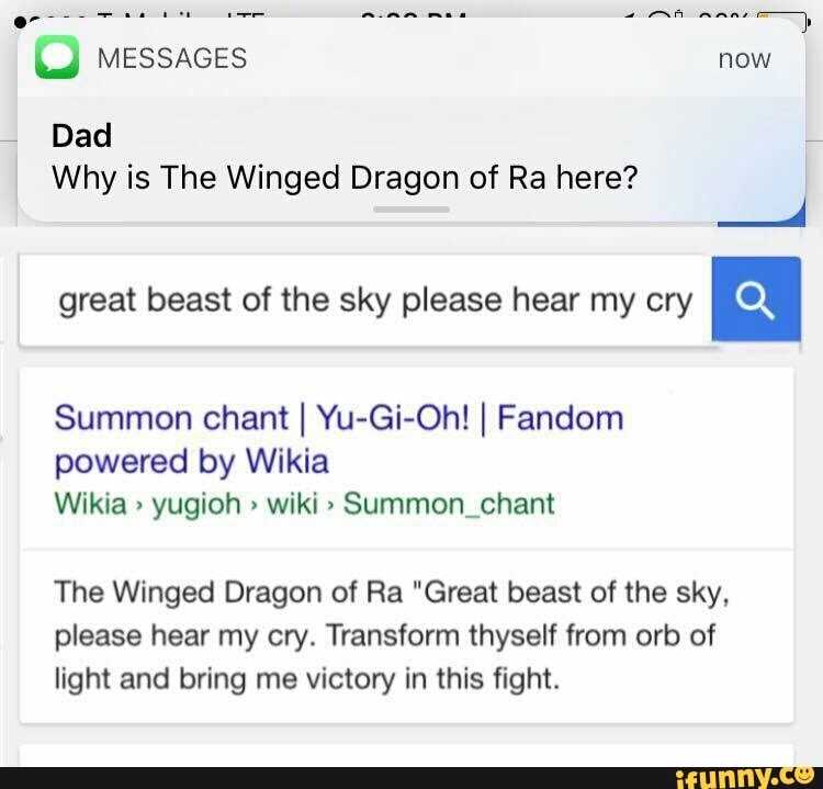 The following are the chants used by yami yugi pharaoh atem and yami marik to summon the winged dragon of ra in the anime. Almighty protector of the sun and sky i beg of thee please heed my cry. But first i shall call out thy name winged dragon of ra black luster soldier as yami yugi. This article is about the legal yu gi oh.