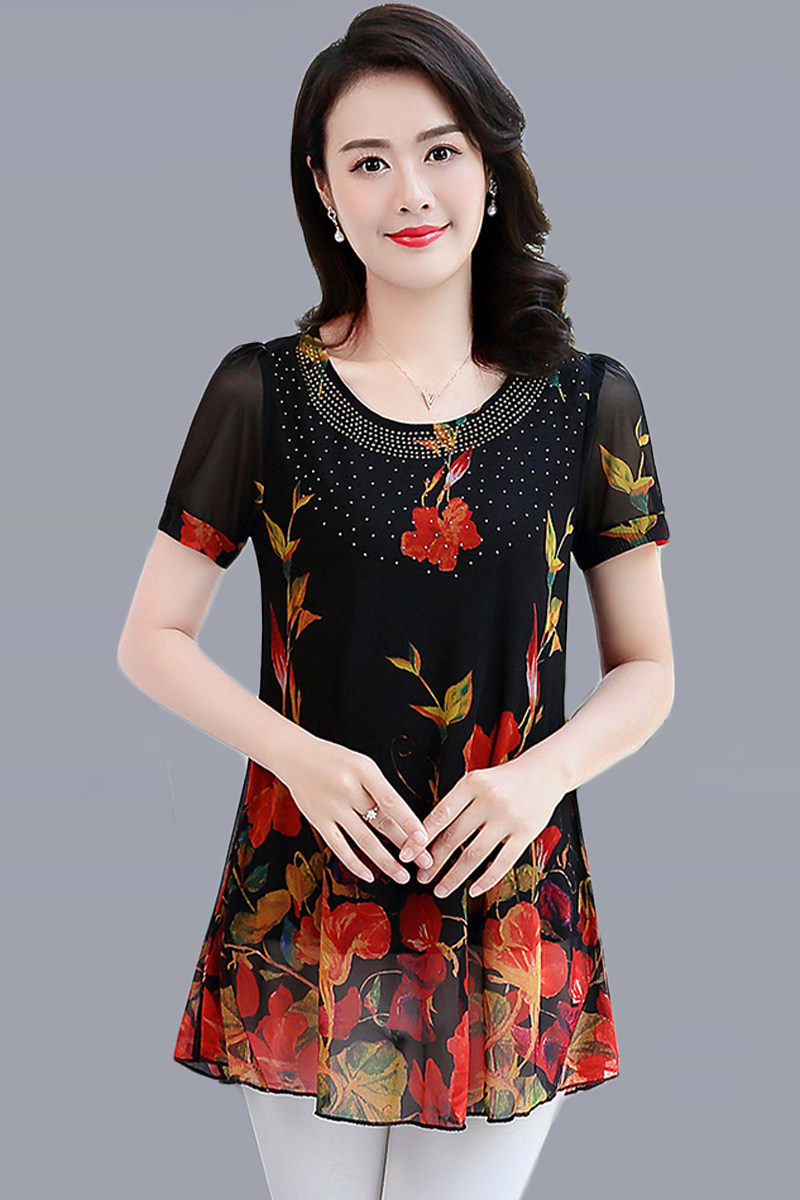 Trung Nien Va Mẹ Gia ăn Mặc Thời Trang Kim Cương Nạm Ao Sơ Mi Mỏng Nữ Mua He 2018 Mới Kich Thước Lớn Dai Ngắn Tay Ao Voan Lumtics Lumtics